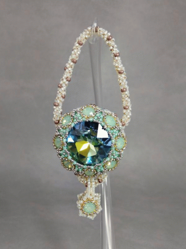 Ich habe an einem Zoom Workshop der Designerin teilgenommen. Schon öfters wollte ich sie kennenlernen, aber es hat sich nie ergeben. Der Pfau gefiel mir so gut, da hab ich mich einfach angemeldet und mitgemacht. Zwar trage ich fast nie Broschen, aber vielleicht könnte man da was ändern. Gesagt, getan. Auf der Rückseite habe ich an der Broschenadel einen sogenannten Converter/Umwandler drangemacht, jetzt ist der Pfau auch als Anhänger zu tragen. Die Technik selbst war für mich nicht sehr neu. Das was ein bisschen mehr tricky war, waren die 15 Rivoli in den Hintern zu bekommen und danach so gut zuzunähen, damit nichts rausfällt. Aber auch das ist geschafft! Am Schwierigsten war und wird es wohl auch bleiben, den Pfau vor Schmutz zu schützen. Bis jetzt ist er noch strahlend weiß, aber wie lange noch ???